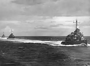 ![]() Destructores estadounidenses (de derecha a izquierda): USS O'Bannon, USS Chevalier, y a la cabeza el USS Taylor, van hacia el puerto de Tulagi en las Islas Salomón el 15 de agosto de 1943, dos días antes de que participen en la Batalla de Horaniu. | ||||