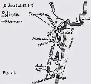 El comandante alemán, Paul Emil von Lettow-Vorbeck, decidió atacar Jassin con el fin de evitar un mayor peligro para Tanga, que se encontraba a más de 50 kilómetros al sur y previamente había sido defendido con éxito contra un ataque británico. Nueve compañías de Schutztruppe con oficiales alemanes se reunieron para el asalto. Inmediatamente después, las tropas británicas se rindieron, los capitanes británicos Hanson y Turner fueron conducidos a Lettow-Vorbeck. El oficial alemán les felicitó por su defensa a la ciudad antes de liberarlos con la promesa de que no participarían más en la guerra.