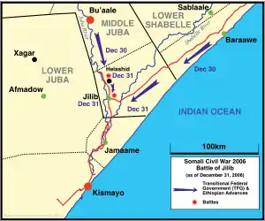 El sábado 30 de diciembre, las tropas combinadas de Etiopía y del Gobierno de transición de Somalia llegaron a Jilib, la principal población en el camino hacia Kismaayo, a unos 130 kilómetros al norte. Sharif Sheid Ahmed instó a los hombres de las UCI que combatieran, afirmando «Si los somalíes están preparados para resistir, nosotros estamos preparados para esto y hemos decidido combatir al enemigo».[4][5]
