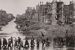 ![]() Soldados soviéticos marchando después de liberar la ciudad | ||||