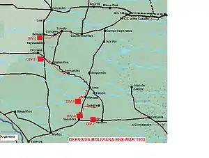 Con el tiempo corriendo en contra debido a que la movilización del ejército boliviano se estaba completando y la época de las lluvias estaba empezando, Estigarribia planeó un último intento pero esta vez a una mayor escala: el Primer Cuerpo paraguayo atacaría con tres divisiones en primera línea, teniendo a la cuarta como reserva. Dos divisiones rodearían el ala izquierda para llegar al camino que conectaba el fortín Saavedra con el fortín Muñoz desalojando a los bolivianos que defendían Saavedra y el fortín Agua Rica.