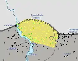El 20 de enero de 2014, tras capturar Yarabulus, Al Qaeda cortó el suministro de agua potable a Kobane,[26] y el 2 de julio de ese año, la ciudad quedó sitiada por los islamistas.