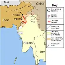 Desde el 15 de marzo de 1944, la 31ª División japonesa cruzó el río Chindwin,[13] cerca de Homalin, trasladándose al noroeste a lo largo de la selva en un frente de unos 95 kilómetros de ancho. Se avanzó bastante a pesar de la dificultad del terreno. El 20 de marzo el ala izquierda de la división, formada por el grueso del 58 ° Regimiento y comandada por el comandante del Grupo de Infantería de la división el mayor General Miyazaki Shigesaburo, se encontraba por delante de la formación vecina, la 15 ° División de Infantería japonesa, cuando se enfrentaron con las tropas indias que cubrían el acceso del norte a Imphal.[14]