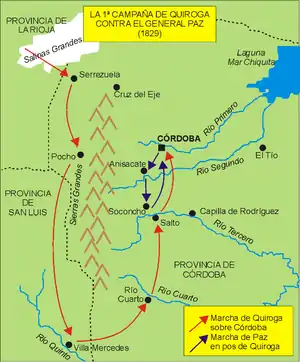 En mayo de 1829 Juan Facundo Quiroga penetró en territorio cordobés con sus fuerzas, sorprendiendo y derrotando a la guarnición de Serrezuela que estaba comandada por el coronel de milicias Faustino Allende. Las fuerzas de Quiroga ocuparon Serrezuela y fusilaron a un oficial unitario, al juez de paz y a dos vecinos del lugar.[12] Pero el caudillo riojano descartó un avance directo sobre la ciudad de Córdoba, pues para ello tendría que atravesar las sierras, terreno desventajoso para la caballería (fuerza principal de su ejército). En vez de ello, optó por dar un largo rodeo y franquear las serranías para avanzar contra la ciudad de Córdoba desde el sur. A su paso reunió fuerzas enviadas por las provincias de San Luis, Mendoza, San Juan y Catamarca.