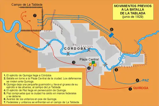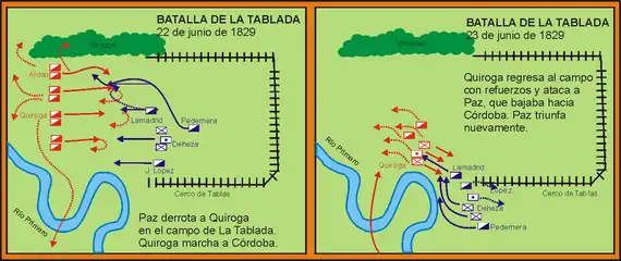 La Batalla de La Tablada fue un enfrentamiento armado de las guerras civiles argentinas entre unitarios y federales en el siglo XIX. Se libró en un paraje cercano a la ciudad de Córdoba, donde actualmente se halla el barrio Cerro de las Rosas de esa ciudad[11] los días 22 y 23 de junio de 1829. La victoria correspondió al ejército unitario, cuyo jefe Paz pudo consolidar su situación política y militar en la provincia de Córdoba.
