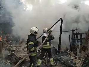 ![]() Bomberos ucranianos apagan las llamas de un incendio provocado por los bombardeos rusos en Lisichansk, el 1 de julio de 2022. | |||||