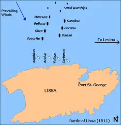 La batalla de Lissa, que tuvo lugar el 13 de marzo de 1811, fue un enfrentamiento naval entre una escuadra británica y una coalición de naves francesas y venecianas durante la campaña del Adriático de las guerras napoleónicas. En este combate ambas flotas lucharon por la posesión geoestratégica de la isla adriática de Lissa,[2] desde la cual los barcos británicos interrumpían el tráfico marítimo francés. Los franceses necesitaban controlar el mar Adriático para abastecer a su ejército en Iliria, por lo que prepararon una fuerza de invasión en marzo de 1811. El ejército invasor estaba formado por seis fragatas, numerosas embarcaciones más pequeñas y un batallón de soldados italianos.