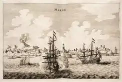 Los neerlandeses se dirigían ordenamente hacia la ciudad, pero un religioso jesuita disparó desde la fortaleza una bala de cañón que aterrizó en un barril de pólvora que se encontraba cerca de los neerlandeses, inflingiéndoles grandes bajas y desorganizándoles. Los comandantes neerlandeses decidieron atacar la colina Guia, pero fueron detenidos por 30 esclavos armados. No esperando tanta resistencia, los neerlandeses se retiraron a las tierras cerca de la colina.