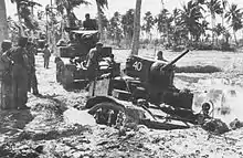 ![]() Soldados del 2.º Batallón del Ejército de los Estados Unidos, 165.ª Infantería, luchan para apuntalarse en la Playa Amarilla en la Isla Butaritari. | ||||