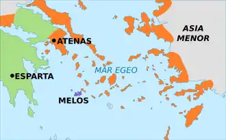 Tras firmar la Paz de Nicias en el 421 a. C., los atenienses y espartanos dejaron de enfrentarse directamente, lo que fue aprovechado por los atenienses para someter a polis neutrales o miembros desleales de la Liga de Delos. Así, en 416 a. C., una flota de 20 trirremes al mando de Alcibíades fue contra Argos y apresó a todos los sospechosos de favorecer a los espartanos.[1] Después reunió una fuerza de 30 naves atenienses, 6 de Quíos y 2 de Lesbos. En ellas se transportaban 1.200 hoplitas propios, 1.500 de sus aliados, 300 arqueros y 20 a caballo.[2] Su objetivo era Melos, una antigua colonia de espartanos fundada siete siglos atrás.[3] Según la versión tradicionalmente aceptada, la isla se había negado a rendir tributos a los atenienses tratando de mantener una posición neutral, pero como los atenienses los amenazaban se habían vuelto abiertamente hostiles.[4]