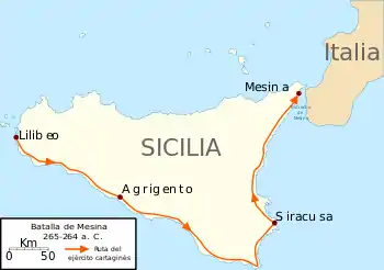 Un conflicto que haría estallar la primera guerra púnica empezó cuando Hierón II decidió recapturar Mesina. Durante el periodo comprendido entre el 270 y 265 a. C. infligió serias derrotas a los mamertinos y llegó incluso a las puertas de la ciudad. Para evitar la caída de Messana, pactaron con los cartagineses y aceptaron mantener en la ciudad una guarnición cartaginesa. A cambio, estos consiguieron que Hierón aceptara detener sus acciones militares.