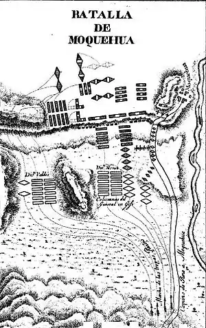 ![]() Croquis del ataque de las dos columnas realistas a las posiciones patriotas apoyadas en su izquierda en la villa de Moquegua. | ||||