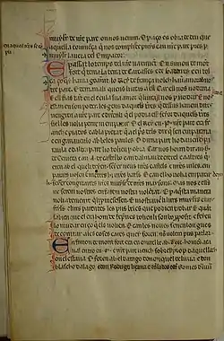 E'N Simon de Montfort era en Murel be ab .DCCC. homens a caval tro en .M., e nostre pare vench sobr'ell prop d'aquel loch on el estava. E foren ab el d'Aragó don Miquel de Luzia, e don Blascho d'Alagó, e don Roderich de Liçana, e don Ladro, e don Gomes de Luna, e don Miquel de Roda, e don G. de Puyo, e don Azmar Pardo, et d'altres de sa maynade molts qui a nos no poden membrar : mas tant nos membre que'ns dixeren aquels que'y avien estat, e sabien lo feyt, que levat don Gomes, e don Miquel de Roda, e Azmar Pardo, e alguns de sa meynade que'y moriren, qu'els altres lo desempararen en la batalla, e se'n fugiren : hí de Catalunya En Dalmau de Crexel, e N'Uch de Mataplana, e En G. d'Orta, e En Bernat dez Castel bisbal, e aquels fugiren ab los altres. Mas be sabem per cert que don Nuno Sanxes, e En G. de Montcada que fiyl d'En G. R. e de Na G. de Castelviy, no foren en la batayla, ans enviaren missatge al Rey que'ls esperas, e'l Rey no'ls volch esperar : e feu la batayla ab aquels qui eren ab el.[22][23][24]La Batalla de Muret, según el Llibre dels fets.