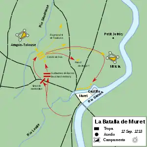 La batalla de Muret fue la batalla decisiva de la llamada cruzada albigense. Se libró el 12 de septiembre de 1213 en una llanura de la localidad fortificada occitana de Muret, unos doce kilómetros al sur de Toulouse.[4] La contienda enfrentó a Pedro II de Aragón, sus vasallos y aliados, entre los que se encontraban Raimundo VI de Tolosa, Bernardo IV de Cominges y Raimundo Roger de Foix, contra las tropas cruzadas y las de Felipe II de Francia mandadas por Simón IV de Montfort.[5]