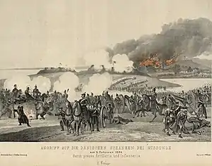 Tuvo lugar entonces un intenso duelo de artillería entre los 20 cañones daneses de los bastiones y los 64 cañones prusianos del cerro (una batería prusiana llegó a disparar más de 300 salvas). Sin embargo, la niebla hizo el identificar y apuntar a las posiciones enemigas algo imposible. Cuando el humo de los cañones se mezcló con la niebla y oscurecio aún más los hitos del terreno, los artilleros en ambos lados se vieron pronto apuntando al centelleo del fuego de cañón de sus adversarios.[1][3]