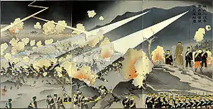 ![]() Impresión Ukiyo-e etiquetada: "En la batalla de Nanshan, nuestras tropas se aprovecharon de una tormenta violenta y cargaron la fortaleza enemiga" por Kobayashi Kiyochika, 1904 | ||||