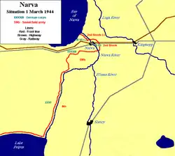 La fuerza aérea soviética llevó a cabo un ataque aéreo, arrasando la ciudad histórica de Narva el 6 de marzo. Un fuerte ataque aéreo y de artillería de 100 000 proyectiles y granadas contra los destacamentos alemanes Nordland y Nederland en Ivángorod preparó el camino para el ataque de la 30.º División de Fusileros de la Guardia el 8 de marzo. Se llevaron a cabo batallas campales simultáneas al norte de la ciudad, donde el 14.° Cuerpo de Fusileros, apoyado por la artillería del 8.° Cuerpo de Fusileros de Estonia, intentó restablecer una cabeza de puente. Los regimientos de la División SS de Estonia rechazaron los ataques, causando graves pérdidas a los soviéticos.[7][6]