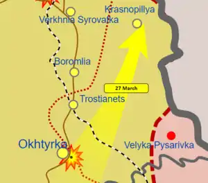 El ejército ruso intentó entrar en Ojtirka y las cercanas Trostianets, pero fracasó varias veces.