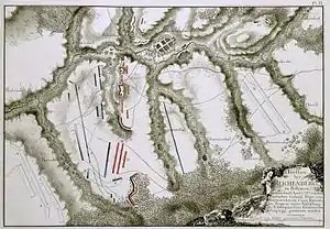 ![]() Planta de la batalla de Reichenberg entre los prusianos bajo el mando del príncipe von Bevern y los imperialistas comandados por el conde Königsegg, el 21 de abril de 1757. Grabado en cobre y coloreado | ||||