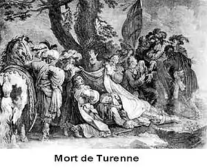 Preocupado por mantener a su joven sobrino, el duque de Elboeuf fuera del peligro le dijo al muchacho: “Quédate donde estás, que se sabe que me acompañan siempre a caballo y me reconocerán”.[4] El Marqués de Saint Hilaire y a otro oficial preguntaron a Turena sobre las disposiciones que debía tomar la columna de ataque, Turena subió a una altura que se encontraba cercana. Montecuculi observó una capa roja y ordenó a los artilleros que se hiciera fuego en aquella posición. Saint Hilarie se encontraba pidiendo al Mariscal si aprobaba la posición de las tropas cuando Turena se inclinó en el pomo de su silla. El caballo comenzó a andar y cuando se detuvo Turena cayó de la silla de montar en los brazos de sus asistentes. Dos veces abrió los ojos y entonces los cerró para siempre. La misma bala arrancó el brazo a Saint Hilaire.[4] Se hicieron grandes esfuerzos por ocultar la muerte del Mariscal sin embargo las lágrimas que el duque de Elboeuf vertía en un manto que cubría algo en el suelo y los soldados comprendieron la catástrofe. Para Montecuccoli, que había escapado de la muerte por los pelos y cuyo caballo había muerto por un cañonazo, la muerte significó rescatar de la grave derrota una esperanza. Pero cuando conoció la noticia exclamó:” Un hombre se ha perdido que era un honor para la humanidad.[4]” Montecuccoli que conoció pronto la muerte del Mariscal no aprovechó la consternación en que se hallaba el ejército francés pero sabiendo de la importancia de la baja del Mariscal no quiso arriesgar más tropas.