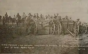 ![]() El general Álvaro Obregón y sus soldados, recogiendo artillería abandonada por el general Pedro Ojeda | ||||
