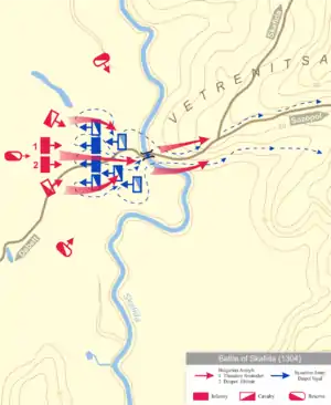 Aparentemente los bizantinos ganaron tácticamente al inicio, haciendo retroceder a los búlgaros hasta el río y obligándoles a cruzarlo en retirada. Pero las tropas bizantinas, creyendo definitiva la victoria, avanzaron desordenadamente sobre el puente que cruzaba el río, que había sido saboteado antes de la batalla por los búlgaros. Con el peso de las tropas bizantinas, el puente colapso, provocando el pánico entre los bizantinos, que con las líneas totalmente rotas, tuvieron que hacer frente al contraataque búlgaro. Totalmente desbordados, los bizantinos acabaron retirándose en desbandada y los búlgaros se hicieron con la victoria.