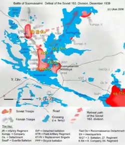 El ataque finlandés empezó el 11 de diciembre. Copiando técnicas alemanas de asalto, se dividieron las tropas finlandesas en cuatro grupos: reconocimiento, apoyo, asalto y explotación. La vanguardia se movería rápidamente en esquíes recogiendo información de posibles puntos de reunión y concentración de tropas enemigas. Entonces los grupos de apoyo abrirían fuego contra los soviéticos, y al recibir una señal se trasladarían a otra posición a 200 metros de su posición anterior, donde continuarían abriendo fuego. Entre dos grupos de apoyo quedaría así un corredor que los grupos de asalto utilizarían para atravesar rápidamente las golpeadas unidades soviéticas, atacándolas con granadas y armas automáticas. De esta manera, los grupos de asalto atravesarían el cercado grupo soviético y saldrían del otro lado. Luego el grupo de explotación entraría al corredor y fortalecería su posición, separando a un número de tropas enemigas de la fuerza principal, que posteriormente serían destruidas. Como las tropas soviéticas se encontraban dispersas por todo el camino, esta técnica era ideal, ya que no era mucha la profundidad a la que tenían que penetrar las fuerzas atacantes. Si los grupos soviéticos aislados intentaban flanquear a las fuerzas finlandesas que ocupaban el camino, tenían que pasar por los lagos congelados, que estaban vigilados por ametralladoras. Cuando la ruta de suministros de la 163.ª División también fue cortada, esta no pudo esperar recibir ayuda externa.