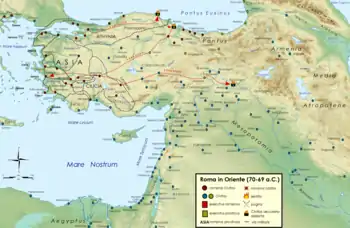 Lúculo se asombró al escuchar esto en el 70 a. C., y comenzó a preparar su invasión de Armenia.[8] Aunque no tenía ninguna autorización del Senado para tal acto, intentó justificarse al distinguir al rey Tigranes como el enemigo y no a sus súbditos. En el verano del 69 a. C., marchó con sus tropas a través de Capadocia, cruzó el Éufrates y entró en la provincia armenia de Sophene, donde estaba Tigranocerta.