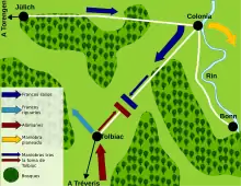- Esta obra contiene una traducción derivada de «Bataille de Tolbiac» de Wikipedia en francés, publicada por sus editores bajo la Licencia de documentación libre de GNU y la Licencia Creative Commons Atribución-CompartirIgual 3.0 Unported.