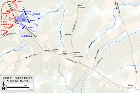 Cerca de la estación de Trevilian, Virginia, a seis millas al sudeste de Gordonsville, se enfrentaron el 11 de junio, La avanzada de la caballería unionista fue rodeada por los hombres de Hampton. Sólo los refuerzos de Sheridan evitaron el desastre y tomar la estación Trevilian, que obligaron a Hampton a retirarse varias millas hacia Gordonsville, al oeste de la estación. A la mañana siguiente, después de destruir 5 millas de ferrocarril, la fuerza combinada de caballería de la Unión hizo varios asaltos contra una línea fortificada que los confederados habían edificado durante la noche al oeste de la estación Trevilian, pero todos los ataques fueron rechazados.[1]