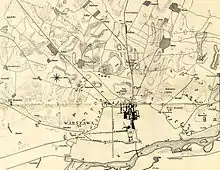 A finales del siglo XVIII y principios del siglo XIX, Varsovia creció rápidamente. A medida que Polonia atravesaba un período de agitación y guerras devastadoras constantes, carecía de fortificaciones permanentes modernas. Para compensarlo, se construyeron tres líneas de terraplenes , murallas y empalizadas a ambos lados del Vístula. Los terraplenes, generalmente de varios metros de altura y construidos principalmente de arena y arcilla, fueron reforzados con gaviones y rodeados por un foso seco, una empalizada y una línea de trous de loup. La tercera línea interior corría aproximadamente a lo largo de las antiguas Murallas de Lubomirski, demolidas solo un par de años antes. Era una línea continua de terraplenes de 3 metros de altura, reforzada por numerosos fuertes y casas fortificadas. La segunda línea de defensas consistía en fortalezas de 400 a 600 metros frente a la línea interna de defensas. Las fortalezas más fuertes estaban a lo largo del camino hacia Kalisz.La primera línea externa de defensas consistía en fortalezas y murallas más pequeñas que corrían a lo largo de una línea semicircular desde Szopy, a través de Rakowiec, Wola y Parysów hasta las orillas del Vístula. Los puestos avanzados fortificados de la línea exterior estaban a 1,5 a 3 kilómetros frente a la tercera línea. Su propósito era resistir los ataques iniciales y dividir las fuerzas rusas atacantes en grupos más pequeños. Había cinco grandes grupos de terraplenes en la línea exterior: