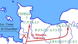 Durante la campaña contra los vénetos, Cayo Julio César envía al legado Quinto Titurio Sabino al territorio de los revoltosos unelos con 3 legiones romanas.[1] Poco después de su llegada a la zona, los eburovices y lexovios masacran a los miembros de sus Senados que se mostraron favorables a hacer la paz con la República romana y se unen a los unelos junto a voluntarios y mercenarios de toda la Galia.[2]