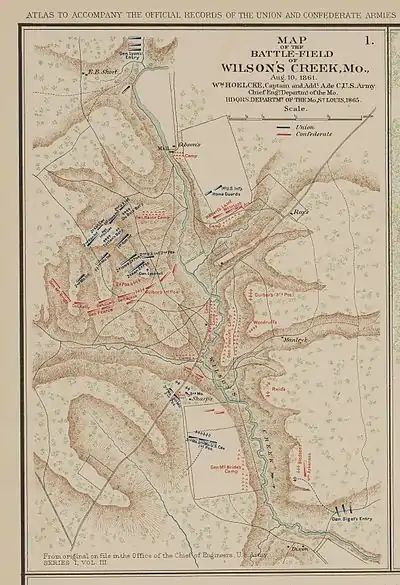 En agosto, los confederados al mando del general de brigada Benjamin McCulloch y las tropas de la Guardia Estatal de Missouri al mando del mayor general Sterling Price se acercaron a las fuerzas del general de brigada del Ejército del Oeste Nathaniel Lyon, acampado en Springfield. El 10 de agosto, Lyon, en dos columnas comandadas por él mismo y el coronel Franz Sigel, atacó a los confederados en Wilson's Creek, a unas 10 millas (16 km) al suroeste de Springfield. La caballería confederada recibió el primer golpe y se retiró del terreno elevado. La infantería confederada atacó a las fuerzas de la Unión tres veces durante el día, pero no logró abrirse paso. Finalmente, la columna de Sigel fue conducida de regreso a Springfield, lo que permitió a los confederados consolidar sus fuerzas contra la columna principal de Lyon. Cuando Lyon murió y el general Thomas William Sweeny resultó herido, el mayor Samuel D. Sturgis asumió el mando de las fuerzas de la Unión. Cuando Sturgis se dio cuenta de que sus hombres estaban agotados y sin municiones, ordenó retirarse a Springfield. La batalla fue contada como una victoria confederada, pero los confederados estaban demasiado desorganizados y mal equipados para perseguir a las fuerzas de la Unión en retirada.
