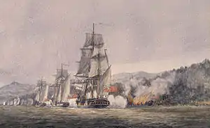 ![]() La embarcación Royal Savage encallada e incendiada, mientras es atacada por la flota británica (acuarela de autor desconocido, 1925) | ||||