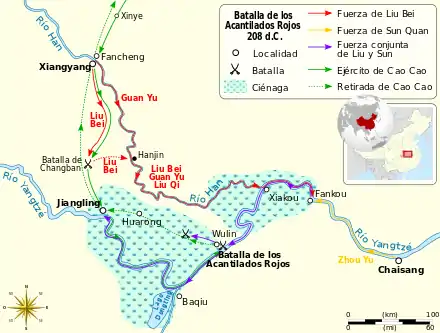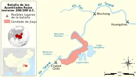 Controlar el río Yangtsé a su paso por la provincia de Jing (las actuales provincias de Hubei y Hunan) era clave para el éxito de su estrategia, pues si Cao Cao tenía alguna esperanza de reunificar el escindido imperio Han debía asegurar el curso medio del río y la estratégica base naval de Jiangling como forma de acceso a las regiones del sur.[8] Dos señores de la guerra controlaban las regiones del Yangtsé que eran claves para el éxito de Cao Cao: Liu Biao, gobernador de la provincia de Jing que dominaba la zona oeste de la desembocadura del río Han, alrededor de la ciudad de Xiakou y todos los territorios al sur de la misma, y Sun Quan, gobernante de la ribera este del Han y de todos los territorios al sureste del río.[9] Un tercer aliado, Liu Bei, estaba viviendo refugiado con Liu Biao en el acuartelamiento de Fancheng (la actual Xiangfan) tras haber huido desde el noreste a la provincia de Jing a causa de un fallido complot para asesinar a Cao Cao y restaurar el poder de la dinastía imperial.[10][11]