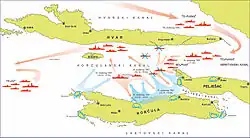 Las islas de Lastovo y Vis fueron las bases de las unidades de la Armada del Ejército Popular Yugoslavo y fueron ocupadas hasta que el acuerdo del alto el fuego llegó a final de año, cuando ambas fueron evacuadas por el JNA. Las unidades navales de la Armada Yugoslava intentaron acciones militares contra los puertos croatas situados más al norte, en especial el 15 de noviembre, cuando una fragata bombardeaó el Puerto de Split donde fue alcanzado y dañado el ferry Vladimir Nazor matando a dos miembros de su tripulación.[17]Otro barco, el Bartol Kasic también fue alcanzado por uno de los numerosos ataques.[18] El ataque fue en represalia por los daños sufridos por la patrullera JRM PC-176 Mukos después de ser minada o alcanzada por un torpedo.[19] Más tarde fue alzada, reparada y puesta en servicio por la marina de guerra croata con el nombre de OB-62 Šolta.[18] La Marina de Guerra de Yugoslavia fue rechazada finalmente por el fuego de «artillería de costa» el 16 de noviembre cuando las fuerzas navales dirigidas por los serbios perdieron dos barcos dragaminas debido al éxito de las armas de 76 mm que Croacia poseía en el canal de Korčula. El primer buque, un ML-144, se hundió en aguas poco profundas en la Bahía de Torač, en la isla de Hvar y un dragaminas, el ML-143, se hundió frente a la isla de Scedro.[20]