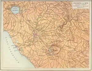 ![]() Mapa de los alrededores de Roma en la Antigüedad en el que se ha señalado la presencia de Tusculum, próximo al monte Álgido | ||||