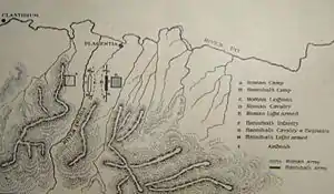 un lugar entre los dos campamentos, completamente plano y sin árboles, pero bien adaptado para una emboscada, el cual era atravesado por un arroyo con los bancos escarpados, con una densa vegetación que incluían zarzas y otras plantas espinosas, y aquí él propuso colocar una guarnición para sorprender al enemigo.[10]
