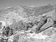 Al mismo tiempo la República popular de China entró en el conflicto tras lanzar varias advertencias a las Naciones Unidas.[13] El 19 de octubre de 1950, numerosas formaciones de tropas chinas, denominadas Ejército Popular de Voluntarios (EPV), cruzaron secretamente la frontera con Corea del Norte.[14] Una de las primeras unidades chinas en llegar al embalse del área de Chosin fue el 42.º Cuerpo del EPV, y se le encargó detener el avance oriental de las NU.[15] El 25 de octubre, el I Cuerpo de la RDC en avance estableció contacto los chinos y se detuvo en el paso de Funchilin, al sur del embalse de Chosin.[16] Tras desembarcar en Wonsan, el X Cuerpo de la 1.ª división de marines de EE. UU. se encargó de la defensa contra la 124.ª división del EPV el 2 de noviembre, y la batalla resultante causó grandes bajas entre los chinos.[17] El 6 de noviembre, el 42.º Cuerpo del EPV ordenó la retirada hacia el norte con la intención de atraer a las fuerzas de las NU hacia el embalse de Chosin.[18] El 24 de noviembre, la 1.ª división de marines ocupó tanto Sinhung-ni en el lado este,[nota 5] como Yudami-ni en el lado occidental del embalse.[19]