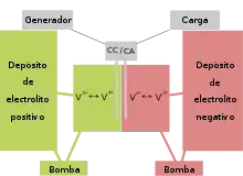 Una batería de flujo es un tipo de batería recargable donde la recarga es proporcionada por dos componentes químicos, disueltos en líquidos contenidos dentro del sistema y separados por una membrana. El intercambio de iones (que proporciona flujo de corriente eléctrica) se produce a través de la membrana, mientras los dos líquidos circulen en su propio espacio respectivo. El voltaje de la celda (pila/batería) se determina químicamente por la ecuación de Nernst y rangos, en aplicaciones prácticas, desde 1.0 a 2.2 voltios.