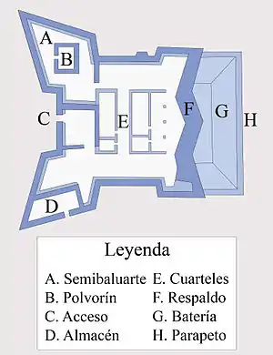 Poseía una batería lineal con seis cañones de a 24, y capacidad para albergar una guarnición de infantería de quince hombres y un oficial, seis artilleros y un cabo y un total de cuatro hombres y un cabo correspondientes al cuerpo de Caballería; el alojamiento de la guarnición se realizaba en las propias instalaciones que estaban perfectamente preparadas para ello, a pesar de todo según los datos conservados en el año 1796 la batería apenas poseía un cabo con diez hombres y dos artilleros. El edificio, de planta rectangular poseía dos baluartes protegiendo su entrada por tierra y una batería paralela a la playa protegida por un espaldón.[1]
