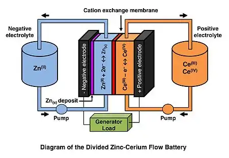 Puesto que el zinc es electrodepositado durante la carga en el electrodo negativo y las reacciones redox de Ce (III) / Ce (IV) tienen lugar en el electrodo positivo, este sistema se clasifica a menudo como una batería de flujo híbrida. A diferencia de la química utilizada en las baterías de flujo redox de zinc-bromuro y de zinc-cloro, no se necesita ningún dispositivo de condensación para disolver los gases de halógeno.