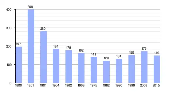 Los datos demográficos contemplados en este gráfico de la comuna de Batilly[5]se han cogido de 1800 a 1999 de la página francesa EHESS/Cassini, y los demás datos de la página del INSEE.[6]