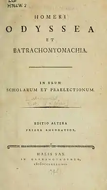 - LUDWICH, Arthur (1896). Die homerische Batrachomachia des Karers Pigres: nebst Scholien und Paraphrase. Leipzig: B.G. Teubner. OCLC 2832477.