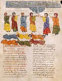 Folio 107r miniado del Beati in Apocalipsin libri duodecim. Vitr-14/1. Escritura visigótica. 144 folios en pergamino a dos columnas, de 33 a 35 líneas por página. Miniatura mozárabe. Procedente de la biblioteca de Serafín Estébanez Calderón y de San Millán de la Cogolla.