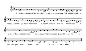 Su canción en occitano A chantar m'er de so qu'eu no volria es la única pieza trovadoresca de autoría femenina cuya música sobrevive intacta.[15] La música de A chantar solo se encuentra en Le manuscript di roi, una colección de canciones copiadas en torno a 1270 para Carlos de Anjou, el hermano de Luis IX.[16] ción)