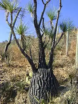 Es una planta rosetófila arborescente dioica, cuya altura puede variar de 6 a 12 m alto. Tallos de base muy ensanchada, de 1,5 a 2,5 m diámetro, globosa, corteza gruesa, de color gris a parda, con formas geométricas rectangulares a poligonales; ramas delgadas, muy ramificadas. Hojas en rosetas apicales, en forma de cono invertido, haz y envés con papilas dispuestas en surcos. Inflorescencias 0,6 a 1 m largo, de forma ovoides, anaranjadas a amarillo pálido; pedúnculos 15 a 20 cm largo; ramas primarias 16 a 20 cm largo, las secundarias 4 a 8 cm largo, escasas; brácteas verde-pálido a blancas. Flores masculinas 4 a 6 por nudo, pedicelos 1 a 2 mm largo, articulados cerca de la base, tépalos 2 a 2,5 mm largo, 1,5 a 2 mm ancho, erectos en antesis (apertura de la flor para su polinización), de color blanco-amarillentos. Flores femeninas, 4 por nudo, pedicelos 1,5-2,5 mm largo, tépalos 1,5-2 mm largo, 1-2 mm ancho, blanco amarillentos. Frutos en cápsulas 0,7 a 0,9 cm largo, 0,6 a 0,8 cm ancho, de color amarillo pálido, alas de 7 a 9 mm largo, 1,5 a 2 mm ancho; semillas 3,5 a 4 mm largo, 3 a 4 mm ancho, esferoidales a elipsoidales, testa rugosa de color pardo-rojiza.[1]