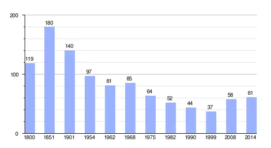 Los datos demográficos contemplados en este gráfico de la comuna de Beauvilliers[4] se han cogido de 1800 a 1999 de la página francesa EHESS/Cassini, y los demás datos de la página del INSEE.[5]