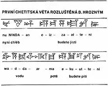 En 1906, en Hattusa (actual Boğazkale, a unos 200 km al este de Ankara), una expedición alemana encontró los archivos de los monarcas hititas en escritura cuneiforme, aunque en un idioma desconocido. Mientras estuvo sirviendo en el Ejército austrohúngaro durante la Primera Guerra Mundial, Hrozný publicó en 1917 una descripción del idioma donde mostraba que pertenecía a la familia indoeuropea.[1]