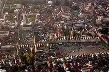 Vista aérea del centro de la ciudad, donde se ve la plaza de los Héroes (con el beffroi) y a la derecha la Gran Plaza